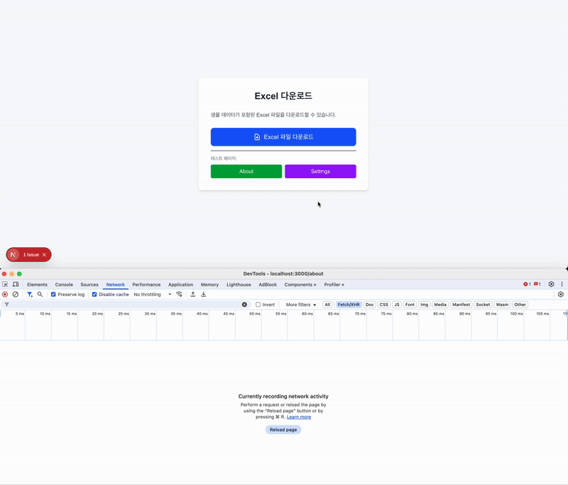 두 번째로 시도한 a 태그를 사용한 로직이다. 영상에서 볼 수 있듯이, 페이지를 이동하면 다운로드를 실패한다.
